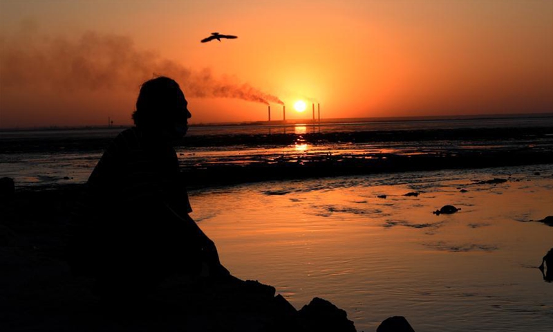 A local resident sits on the beach during sunset in Kuwait City, Kuwait, Aug. 4, 2020. (Photo by Ghazy Qaffaf/Xinhua)