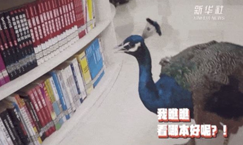 A peacock walks in a college library in Southwest China's Yunnan Province and wanders around book shelves. Photo: Screenshot of a video posted by Xinhua News