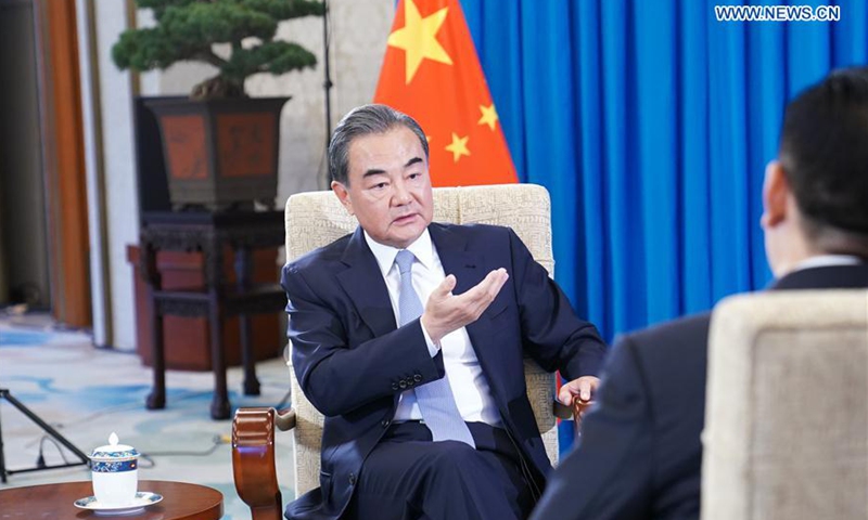 Chinese State Councilor and Foreign Minister Wang Yi gives an exclusive interview to Xinhua on China-US ties in Beijing, capital of China, Aug. 5, 2020. (Xinhua/Zhai Jianlan)