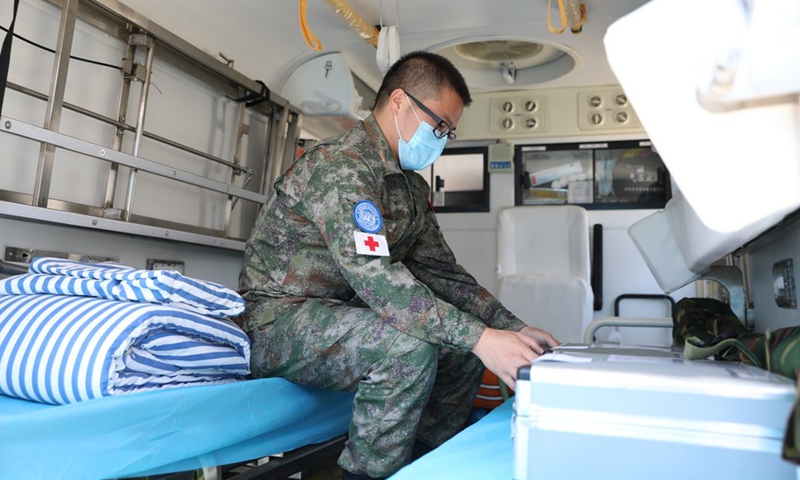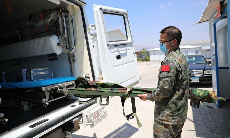 A Chinese peacekeeper prepares stretchers at the camp of the Chinese peacekeeping forces to Lebanon, on Aug. 5, 2020. (Xinhua)