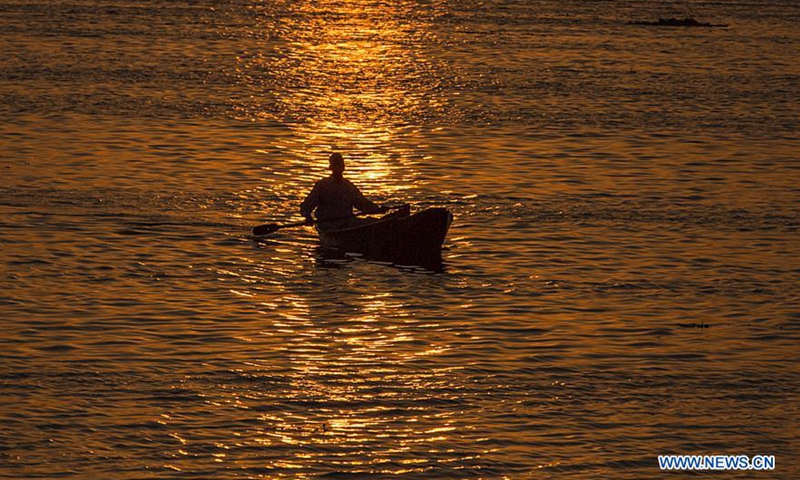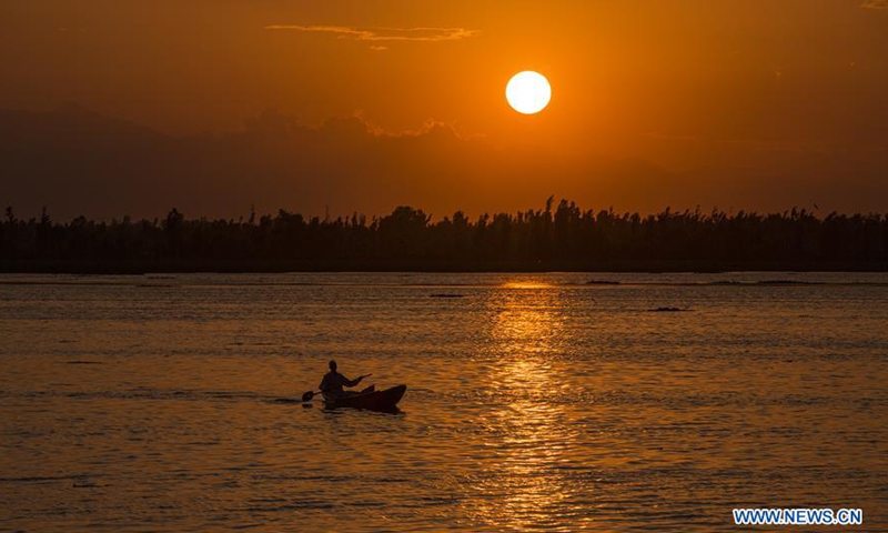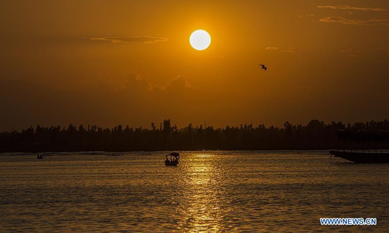 A boatman rows his boat during sunset on Dal Lake in Srinagar city, the summer capital of Indian-controlled Kashmir, Aug. 5, 2020. (Xinhua/Javed Dar)