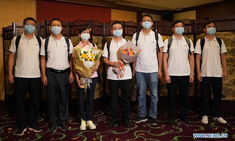 Virus testing professionals from the Chinese mainland pose for a group photo after their arrival in Hong Kong, south China, Aug. 2, 2020. Seven virus testing professionals from the Chinese mainland arrived in Hong Kong on Sunday afternoon as the first batch of mainland supportive teams to help contain a worsening spread of COVID-19 in Hong Kong. (Xinhua/Li Gang)