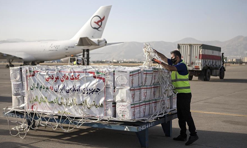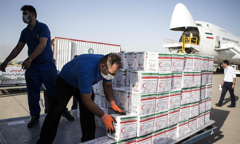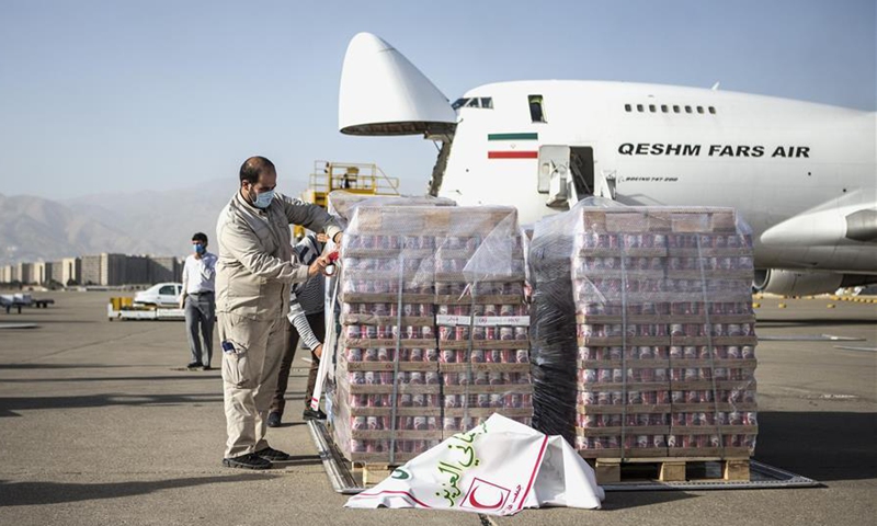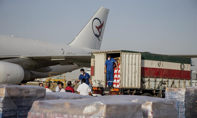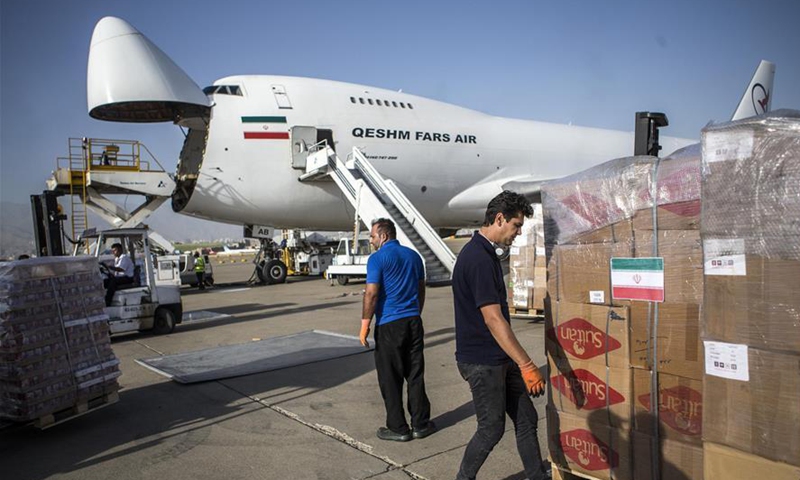 Workers prepare to load boxes of food and medical supplies to an airplane at Mehrabad International Airport in Tehran, Iran, on Aug. 5, 2020. Iran has started sending food, medicine and medical equipment to Lebanon, after the huge explosions at Beirut's port, Press TV reported on Wednesday. (Photo by Ahmad Halabisaz/Xinhua)