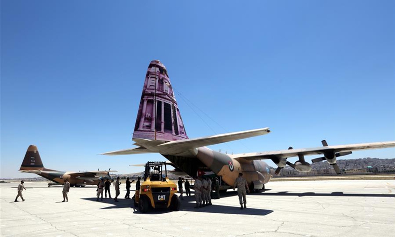 Supplies for a military field hospital are loaded on a plane heading to Beirut at Marka Military Airport in Amman, Jordan, Aug. 6, 2020. King Abdullah II of Jordan on Wednesday instructed that a military field hospital be sent to Lebanon as a rescue unit. (Photo by Mohammad Abu Ghosh/Xinhua)