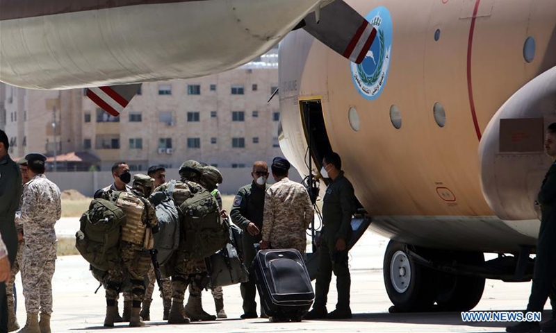 Members of Jordanian Military Field Hospital prepare to board a plane heading to Beirut at Marka Military Airport in Amman, Jordan, Aug. 6, 2020. King Abdullah II of Jordan on Wednesday instructed that a military field hospital be sent to Lebanon as a rescue unit. (Photo by Mohammad Abu Ghosh/Xinhua)