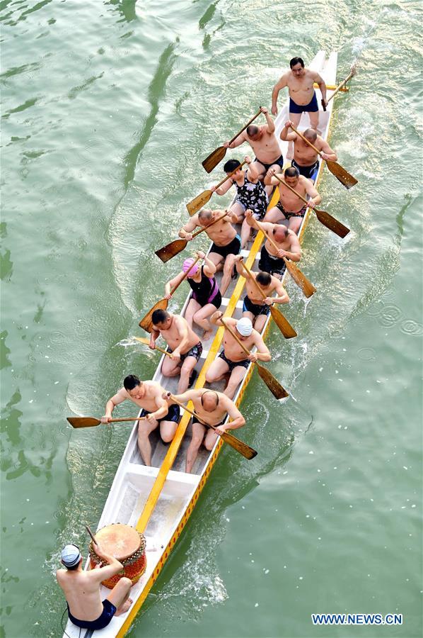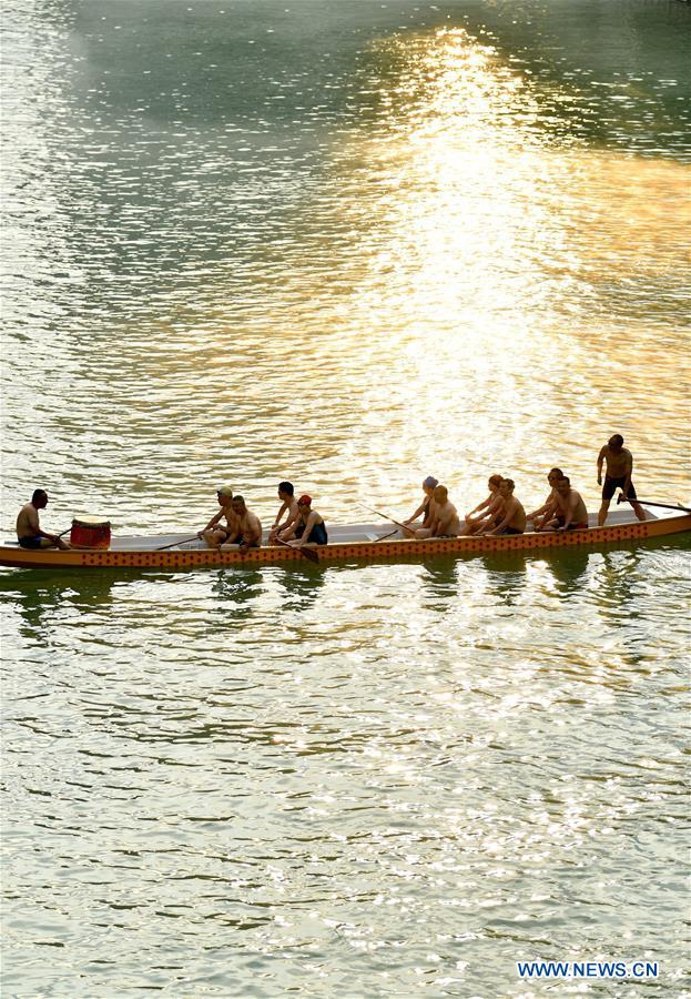 People take morning exercises by rowing a dragon boat on the Gongshui river in Xuan'en County, Enshi Tujia and Miao Autonomous Prefecture, central China's Hubei Province, Aug. 6, 2020. (Photo by Song Wen/Xinhua)