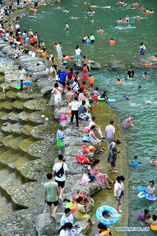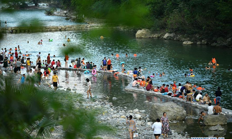 People spend time at the swimming area of Gongshui river in Xuan'en County, Enshi Tujia and Miao Autonomous Prefecture, central China's Hubei Province, Aug. 5, 2020. (Photo by Song Wen/Xinhua)
