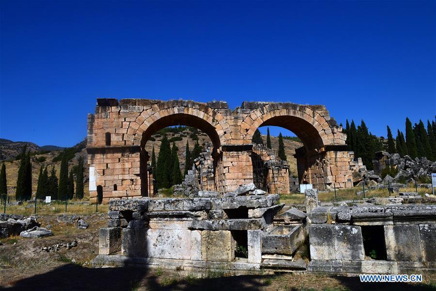 Photo taken on Aug. 6, 2020 shows the ruins of the ancient city of Hierapolis in Denizli, Turkey. The ruins of Hierapolis is listed as a UNESCO World Heritage Site. (Photo by Mustafa Kaya/Xinhua)