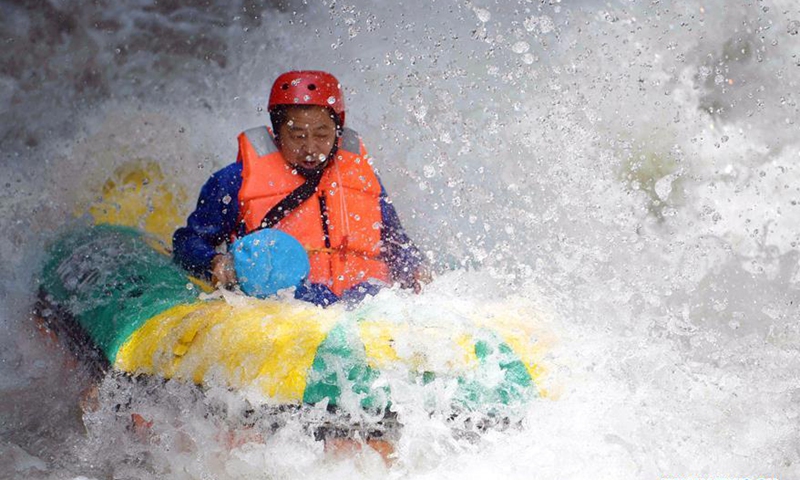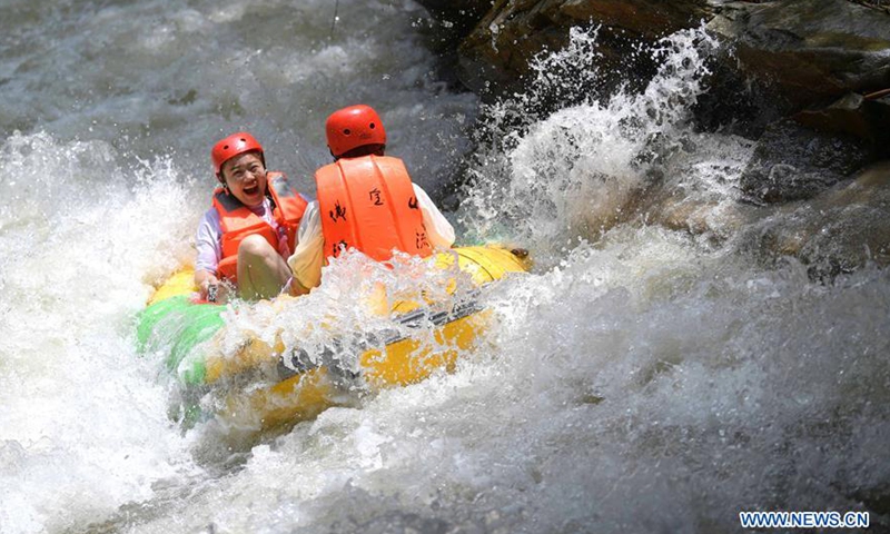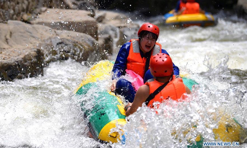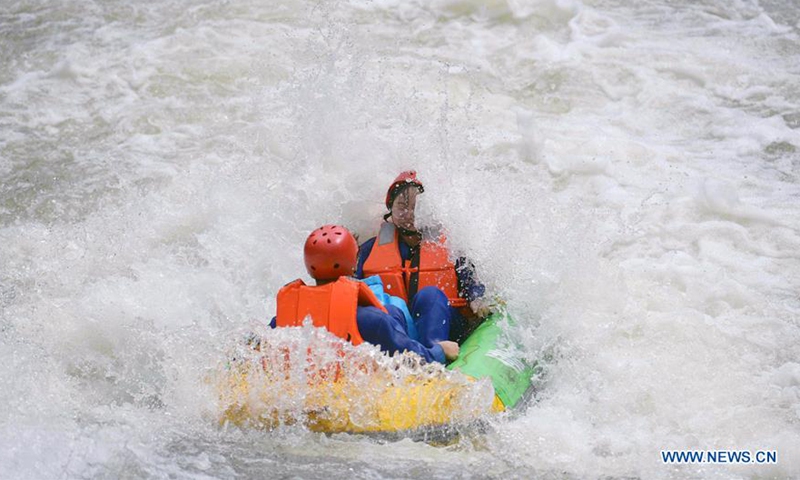 Tourists play drifting at Fubaoshan scenic area in Lichuan City, Enshi Tujia and Miao Autonomous Prefecture, central China's Hubei Province, Aug. 6, 2020. Fubaoshan scenic area has entered the peak travel season as more tourists come here to enjoy coolness in the water amid scorching weather.Photo:Xinhua