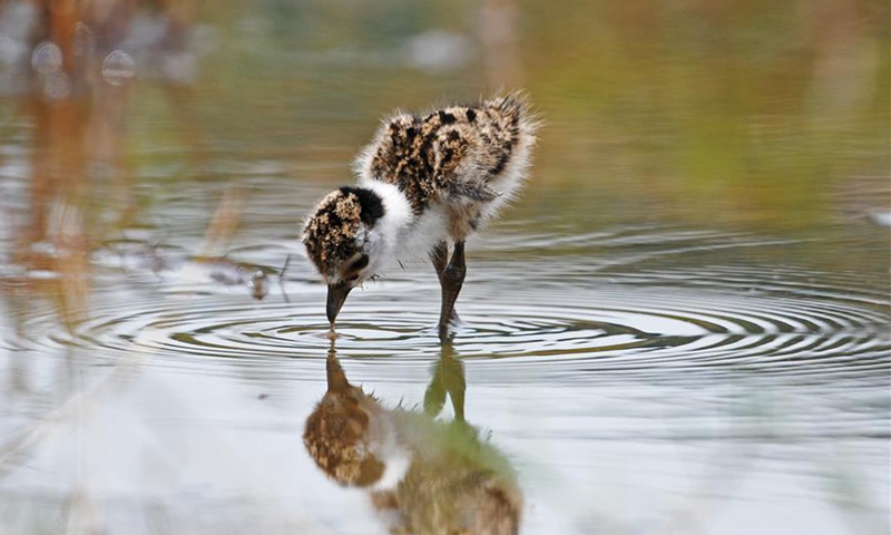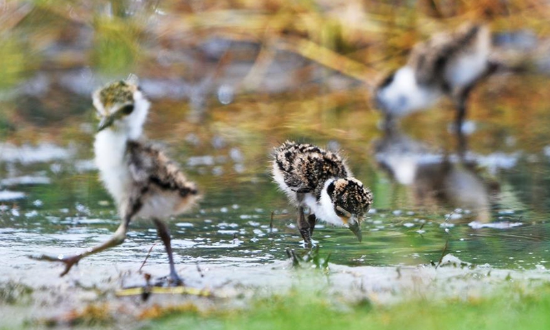 Wild masked lapwing chicks forage for food at Singapore's Gardens by the Bay East, in Singapore, Aug. 6, 2020.Photo:Xinhua