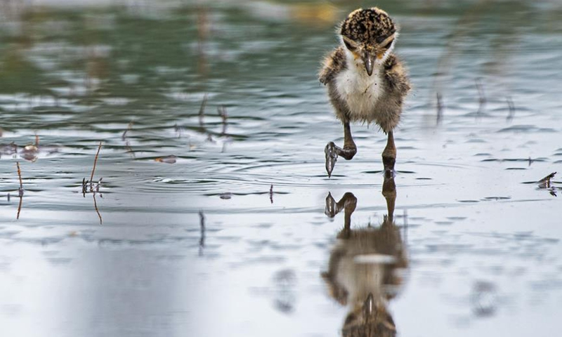 A wild masked lapwing chick forages for food at Singapore's Gardens by the Bay East, in Singapore, Aug. 6, 2020.Photo:Xinhua