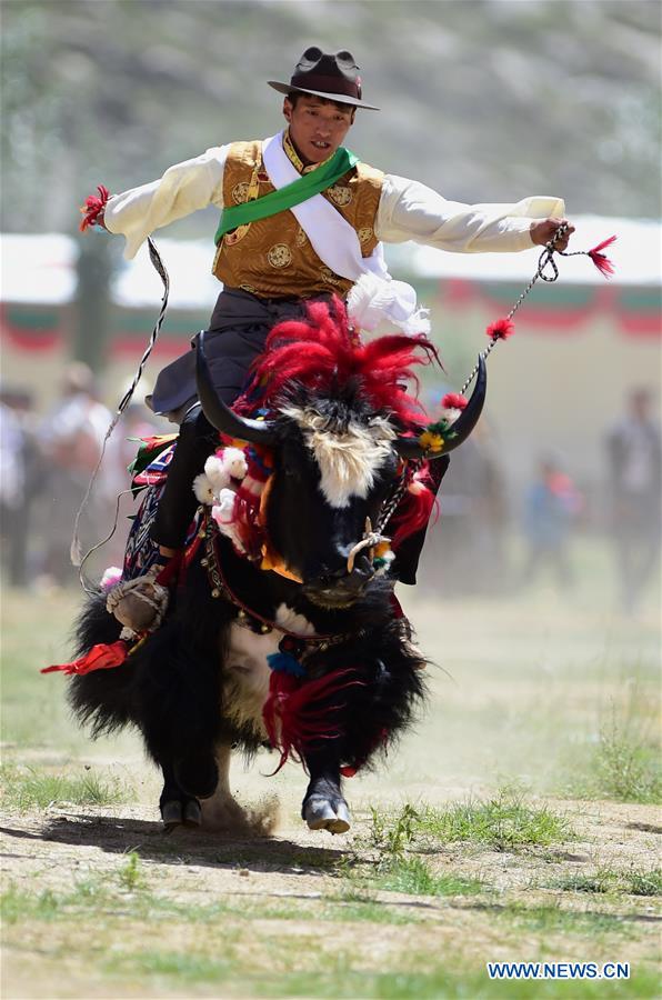 A villager from Quxu County takes part in a yak racing to celebrate the Ongkor Festival in Lhasa, southwest China's Tibet Autonomous Region, Aug. 7, 2020. The Ongkor (Bumper Harvest) Festival, a national intangible cultural heritage, is celebrated annually by local people as they pray for good harvests of crops. (Photo by Soinam Norbu/Xinhua)