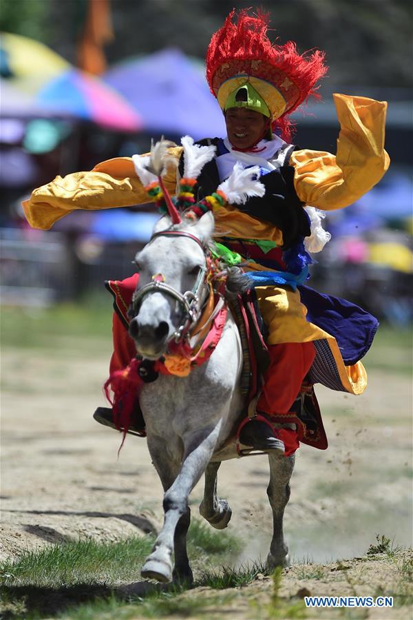 Villagers from Quxu County demonstrate their horse-riding skills during a celebration of the Ongkor Festival in Lhasa, southwest China's Tibet Autonomous Region, Aug. 6, 2020. The Ongkor (Bumper Harvest) Festival, a national intangible cultural heritage, is celebrated annually by local people as they pray for good harvests of crops. (Photo by Soinam Norbu/Xinhua)