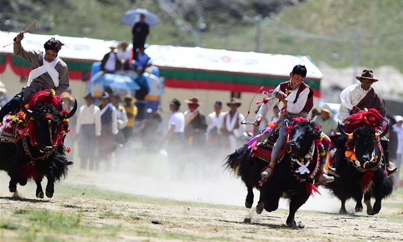 Villagers from Quxu County take part in a yak racing to celebrate the Ongkor Festival in Lhasa, southwest China's Tibet Autonomous Region, Aug. 7, 2020. The Ongkor (Bumper Harvest) Festival, a national intangible cultural heritage, is celebrated annually by local people as they pray for good harvests of crops. (Photo by Soinam Norbu/Xinhua)