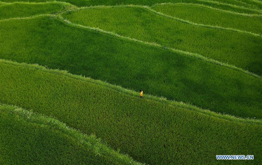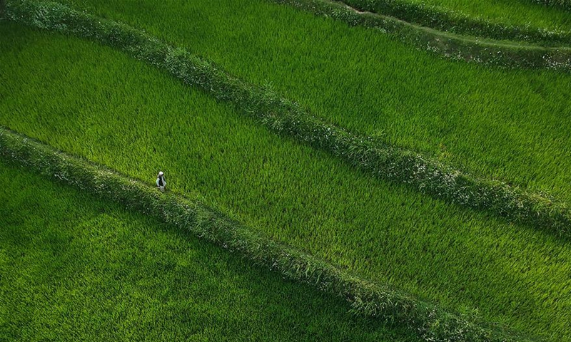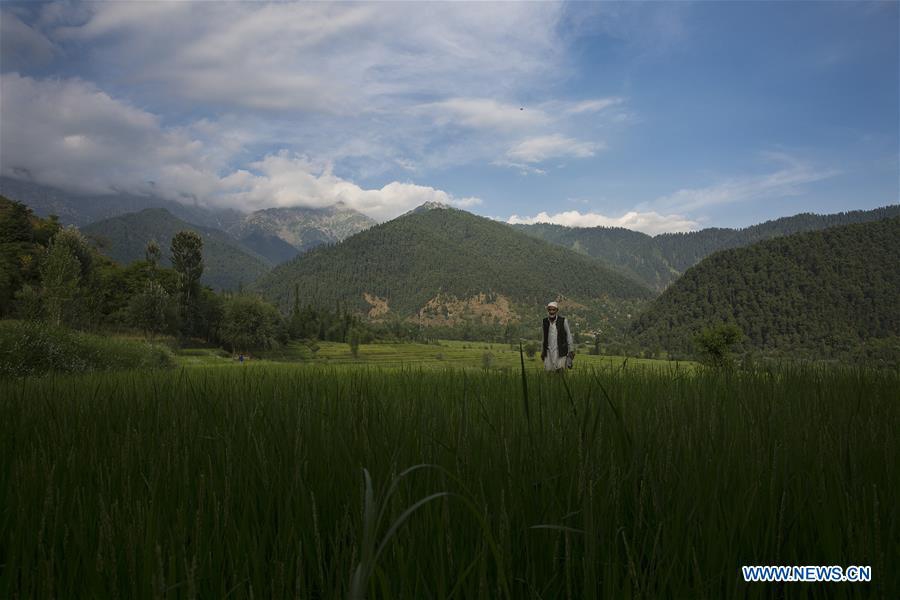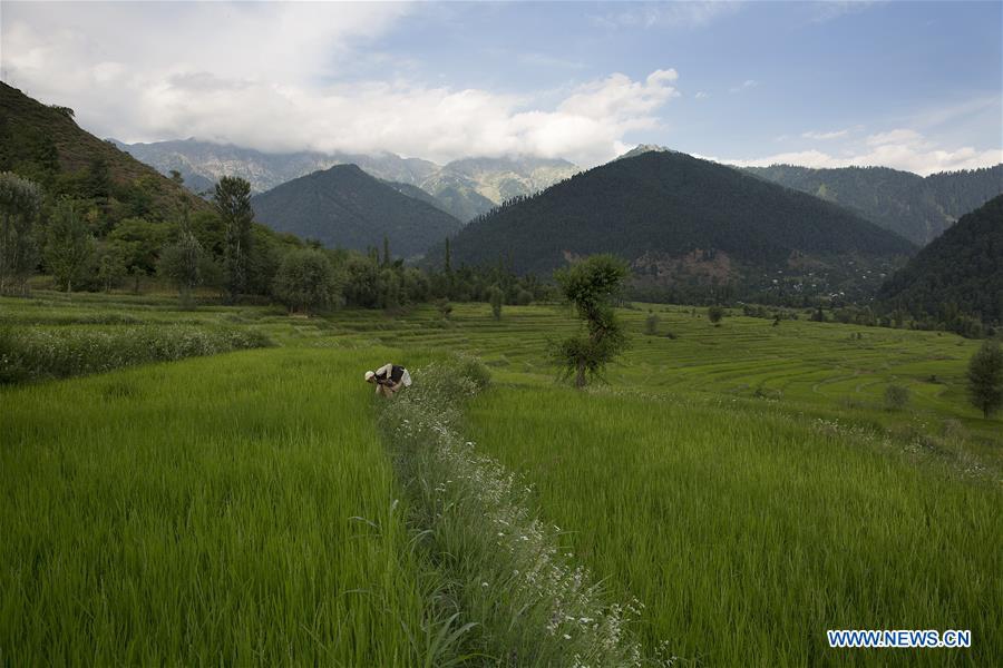 A villager walks in a scenic paddy field in a village in Anantnag, south of Srinagar city, the summer capital of Indian-controlled Kashmir, Aug. 7, 2020. (Xinhua/Javed Dar)