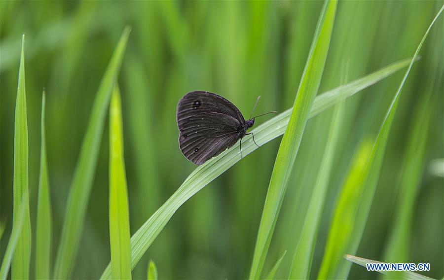 A moth sits on a paddy plant in a paddy field in Anantnag, south of Srinagar city, the summer capital of Indian-controlled Kashmir, Aug. 7, 2020. (Xinhua/Javed Dar)