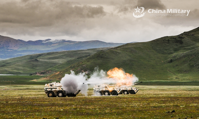 Wheeled self-propelled assault guns attached to a brigade under the PLA 77th Group Army spit fires down range during a live-fire test at the elevation of 4, 500 meters in late July, 2020.Photo:China Military