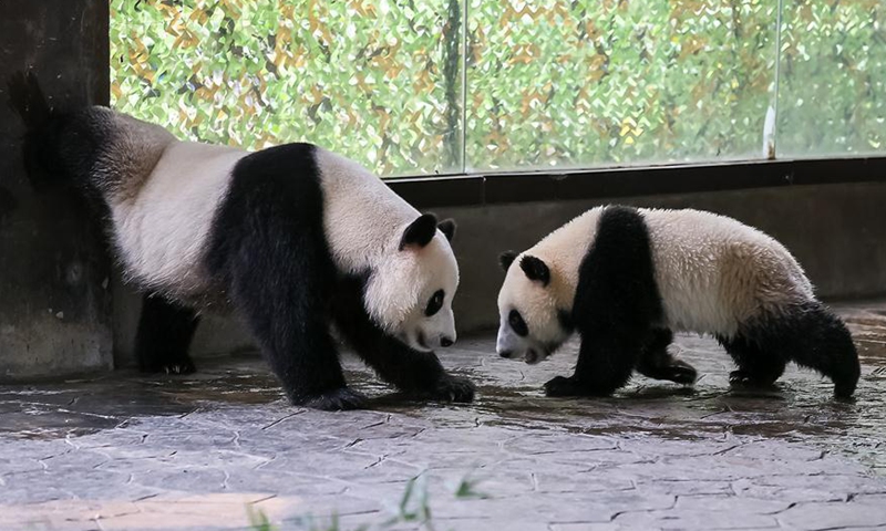"Jiajiazai" (L), baby of giant panda "Jiajia", plays with its mother at the giant panda hall of the Shanghai Wild Animal Park in Shanghai, east China, Aug. 7, 2020. Shanghai Wild Animal Park has recently started a name-collecting campaign for the baby of giant panda "Jiajia". The male giant panda cub was born on Oct. 6, 2019 at the park.Photo:Xinhua