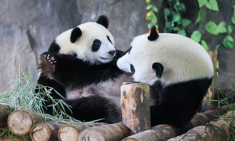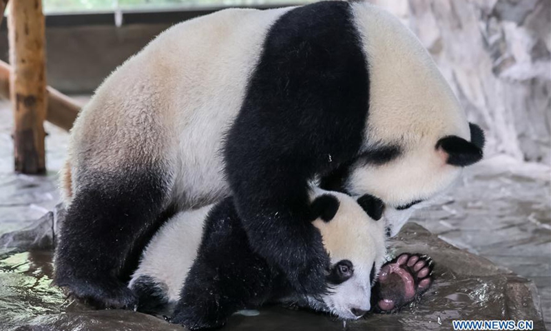 "Jiajiazai" (R), baby of giant panda "Jiajia", plays with its mother at the giant panda hall of the Shanghai Wild Animal Park in Shanghai, east China, Aug. 7, 2020. Shanghai Wild Animal Park has recently started a name-collecting campaign for the baby of giant panda "Jiajia". The male giant panda cub was born on Oct. 6, 2019 at the park.Photo:Xinhua