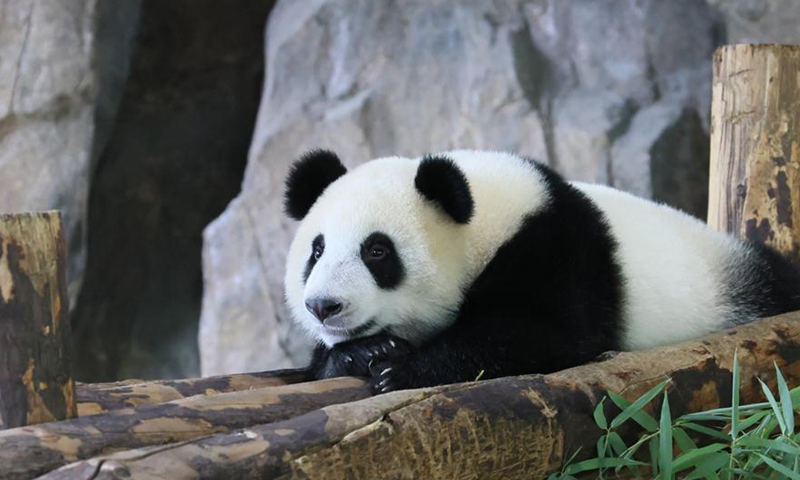 "Jiajiazai", baby of giant panda "Jiajia", rests at the giant panda hall of the Shanghai Wild Animal Park in Shanghai, east China, Aug. 7, 2020. Shanghai Wild Animal Park has recently started a name-collecting campaign for the baby of giant panda "Jiajia". The male giant panda cub was born on Oct. 6, 2019 at the park.Photo:Xinhua