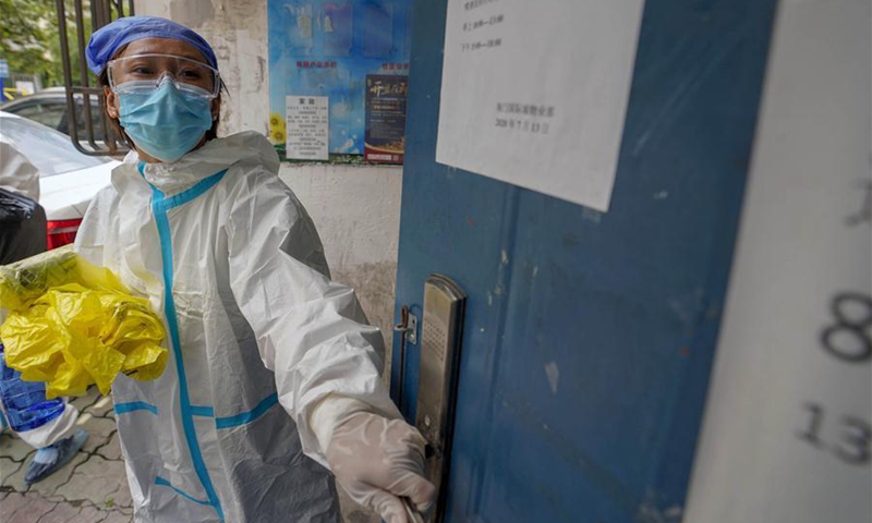 Qiu Tingting prepares to collect garbage of the residents in quarantine at Renminlunan Community, Tianshan District of Urumqi, northwest China's Xinjiang Uygur Autonomous Region, Aug. 6, 2020. Qiu Tingting, 33, the secretary of the Renminlunan Community branch of the Communist Party of China, has been working tirelessly in the community during the COVID-19 epidemic. Residents in this community regard Qiu and her colleagues as "community servants at the frontline of epidemic prevention and control" for their careful and thoughtful work. (Xinhua/Zhao Ge)