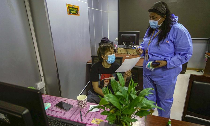 Qiu Tingting (L) discusses work plan with her colleague at an office of Renminlunan Community, Tianshan District of Urumqi, northwest China's Xinjiang Uygur Autonomous Region, Aug. 6, 2020. Qiu Tingting, 33, the secretary of the Renminlunan Community branch of the Communist Party of China, has been working tirelessly in the community during the COVID-19 epidemic. Residents in this community regard Qiu and her colleagues as "community servants at the frontline of epidemic prevention and control" for their careful and thoughtful work. (Xinhua/Zhao Ge)