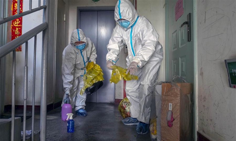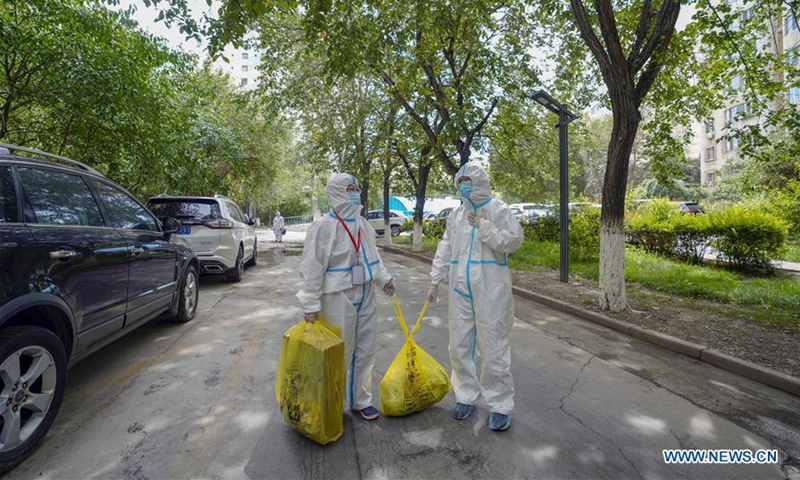 Qiu Tingting (R) collects garbage of the residents in quarantine at Renminlunan Community, Tianshan District of Urumqi, northwest China's Xinjiang Uygur Autonomous Region, Aug. 6, 2020. Qiu Tingting, 33, the secretary of the Renminlunan Community branch of the Communist Party of China, has been working tirelessly in the community during the COVID-19 epidemic. Residents in this community regard Qiu and her colleagues as "community servants at the frontline of epidemic prevention and control" for their careful and thoughtful work. (Xinhua/Zhao Ge)