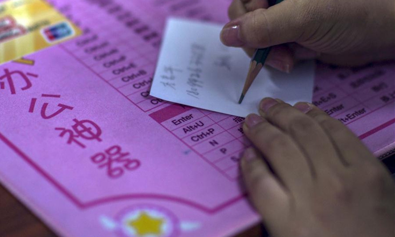 Qiu Tingting makes a to-do list at an office of Renminlunan Community, Tianshan District of Urumqi, northwest China's Xinjiang Uygur Autonomous Region, Aug. 6, 2020. Qiu Tingting, 33, the secretary of the Renminlunan Community branch of the Communist Party of China, has been working tirelessly in the community during the COVID-19 epidemic. Residents in this community regard Qiu and her colleagues as "community servants at the frontline of epidemic prevention and control" for their careful and thoughtful work. (Xinhua/Zhao Ge)