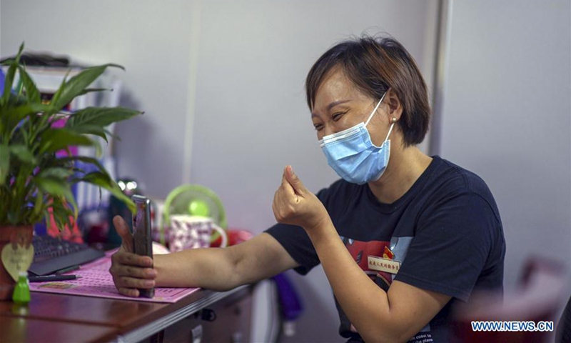 Qiu Tingting makes a video call with her family at an office of Renminlunan Community, Tianshan District of Urumqi, northwest China's Xinjiang Uygur Autonomous Region, Aug. 6, 2020. Qiu Tingting, 33, the secretary of the Renminlunan Community branch of the Communist Party of China, has been working tirelessly in the community during the COVID-19 epidemic. Residents in this community regard Qiu and her colleagues as "community servants at the frontline of epidemic prevention and control" for their careful and thoughtful work. (Xinhua/Zhao Ge)
