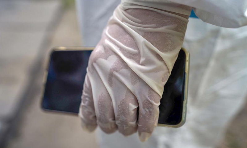 Photo taken on Aug. 6, 2020 shows a sweaty hand of Qiu Tingting in Renminlunan Community, Tianshan District of Urumqi, northwest China's Xinjiang Uygur Autonomous Region. Qiu Tingting, 33, the secretary of the Renminlunan Community branch of the Communist Party of China, has been working tirelessly in the community during the COVID-19 epidemic. Residents in this community regard Qiu and her colleagues as "community servants at the frontline of epidemic prevention and control" for their careful and thoughtful work. (Xinhua/Zhao Ge)