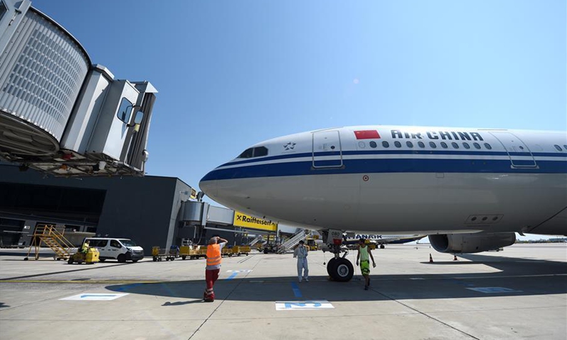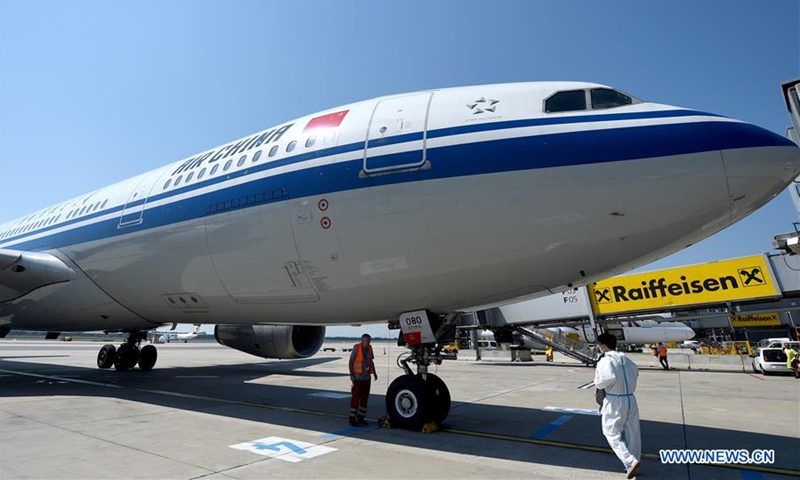 Air China flight CA841 from Beijing lands at Vienna International Airport, Austria, on Aug. 8, 2020. The first direct passenger flight from Beijing to Vienna since the outbreak of the COVID-19 epidemic arrived in Vienna on Saturday. The route will be scheduled every Saturday, according to its operator Air China. (Xinhua/Guo Chen)