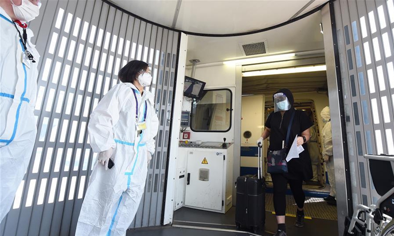 Passengers walk out of Air China flight CA841 from Beijing at Vienna International Airport, Austria, on Aug. 8, 2020. (Xinhua/Guo Chen)