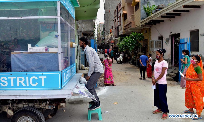A health worker collects swab samples from a resident for COVID-19 tests in Delhi, India, Aug. 4, 2020. (Photo by Partha Sarkar/Xinhua)