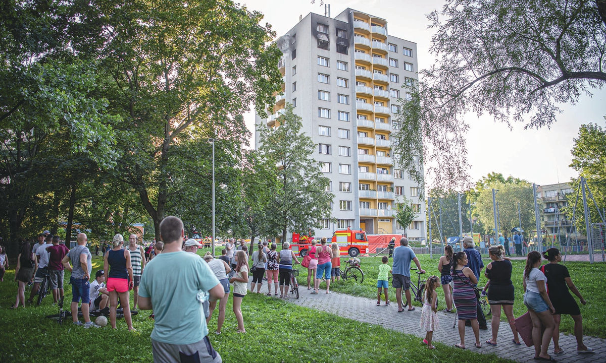 People look on as firefighters work at the scene where a fire broke out in an apartment block in Bohumin, Czech Republic on Saturday. Photo: AFP