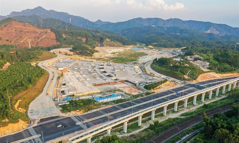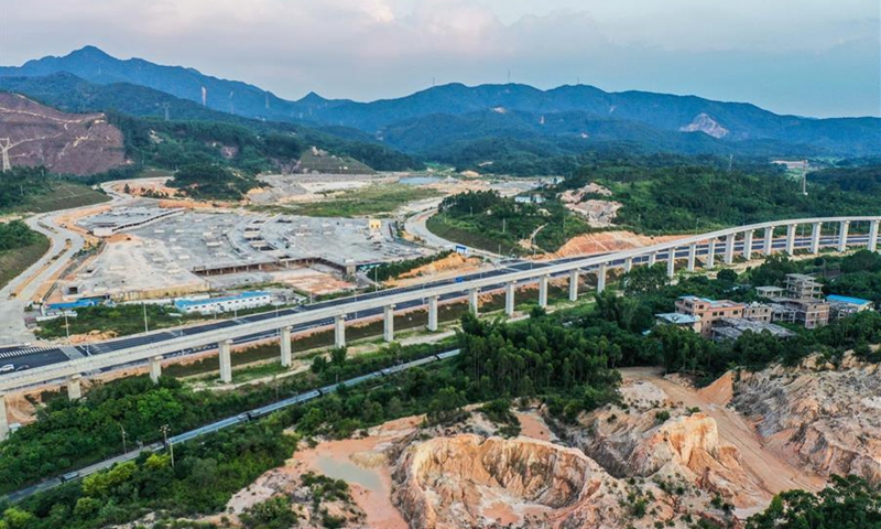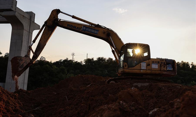 Photo taken on Aug. 9, 2020 shows the construction site of a medium-low-speed maglev railway near Chimelong theme park in Qingyuan City, south China's Guangdong Province. The main project of the Qingyuan maglev tour line is expected to be completed at the end of this year. (Xinhua/Liu Dawei)