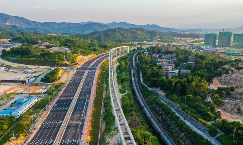 Aerial photo taken on Aug. 9, 2020 shows a medium-low-speed maglev railway under construction near Chimelong theme park in Qingyuan City, south China's Guangdong Province. The main project of the Qingyuan maglev tour line is expected to be completed at the end of this year. (Xinhua/Liu Dawei)
