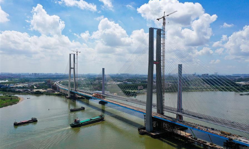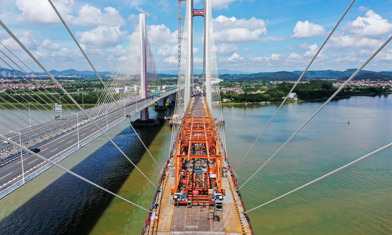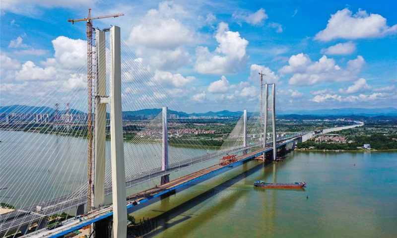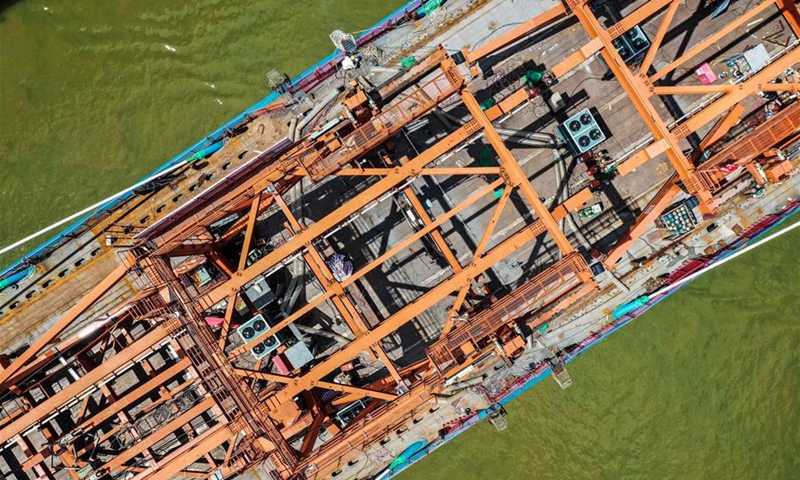 Aerial photo taken on Aug. 9, 2020 shows the installation site of the last steel box girder of a grand cable-stayed railway bridge over Xijiang River in south China's Guangdong Province. The grand cable-stayed bridge, a section for the Nansha Port railway, has finished its final steel box girder installation on Sunday. (Xinhua/Liu Dawei)