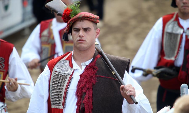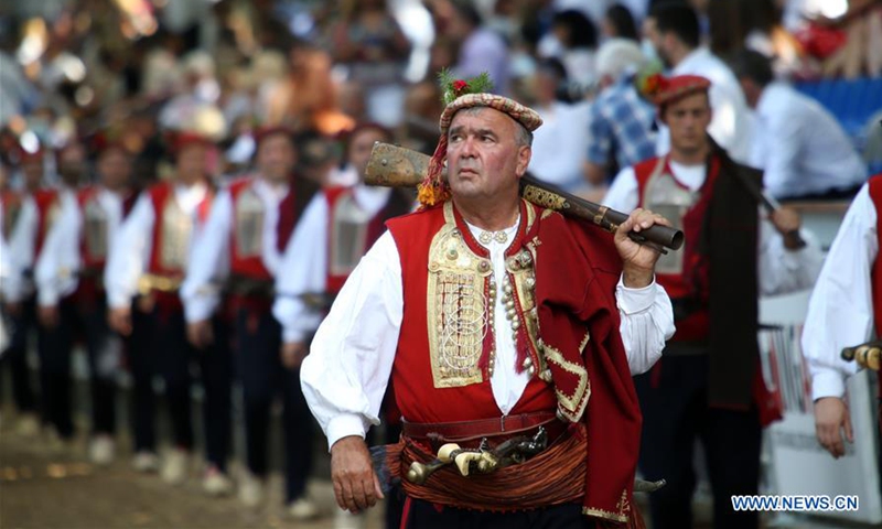 A man in traditional costumes marches during the Sinjska Alka lancing tournament in Sinj, Croatia, on Aug. 9, 2020. Sinjska alka is an equestrian competition held in the Croatian town of Sinj every first Sunday in August to commemorate the victory over Ottomans on Aug. 14, 1715. It was included in the UNESCO Intangible Cultural Heritage List in 2010. (Ivo Cagalj/Pixsell via Xinhua)