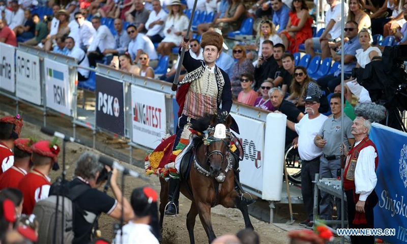 A horseman in traditional costumes competes during the Sinjska Alka lancing tournament in Sinj, Croatia, on Aug. 9, 2020. Sinjska alka is an equestrian competition held in the Croatian town of Sinj every first Sunday in August to commemorate the victory over Ottomans on Aug. 14, 1715. It was included in the UNESCO Intangible Cultural Heritage List in 2010. (Ivo Cagalj/Pixsell via Xinhua)