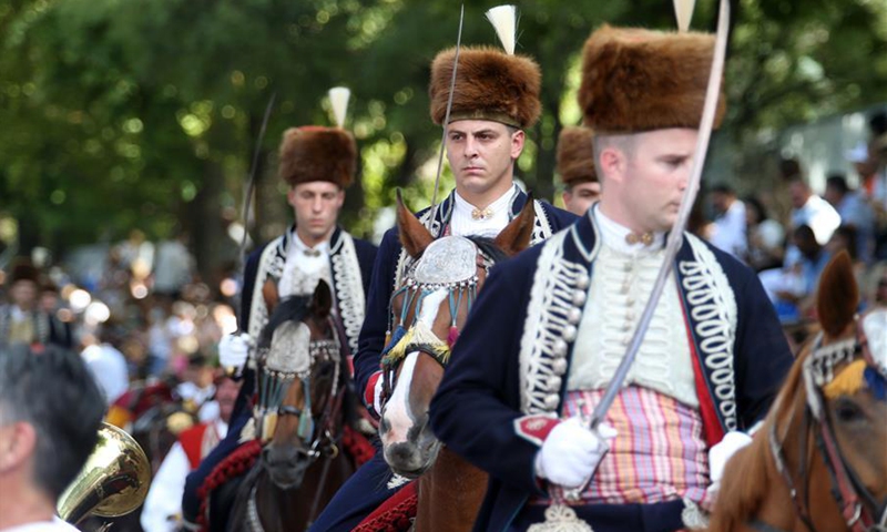 Horsemen in traditional costumes march during the Sinjska Alka lancing tournament in Sinj, Croatia, on Aug. 9, 2020. Sinjska alka is an equestrian competition held in the Croatian town of Sinj every first Sunday in August to commemorate the victory over Ottomans on Aug. 14, 1715. It was included in the UNESCO Intangible Cultural Heritage List in 2010. (Ivo Cagalj/Pixsell via Xinhua)