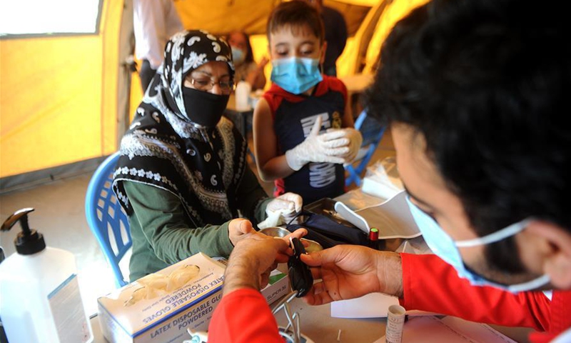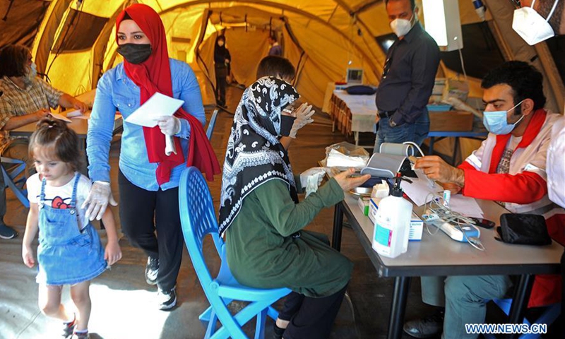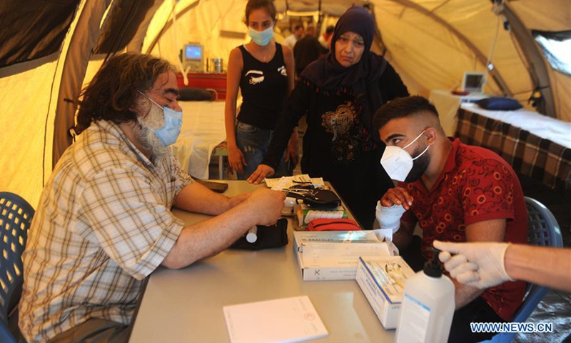 A medical worker treats a patient at the Iran-aided field hospital in Beirut, Lebanon, on Aug. 10, 2020. Lebanon has received field hospitals from a number of countries in the past few days. (Xinhua/Bilal Jawich)