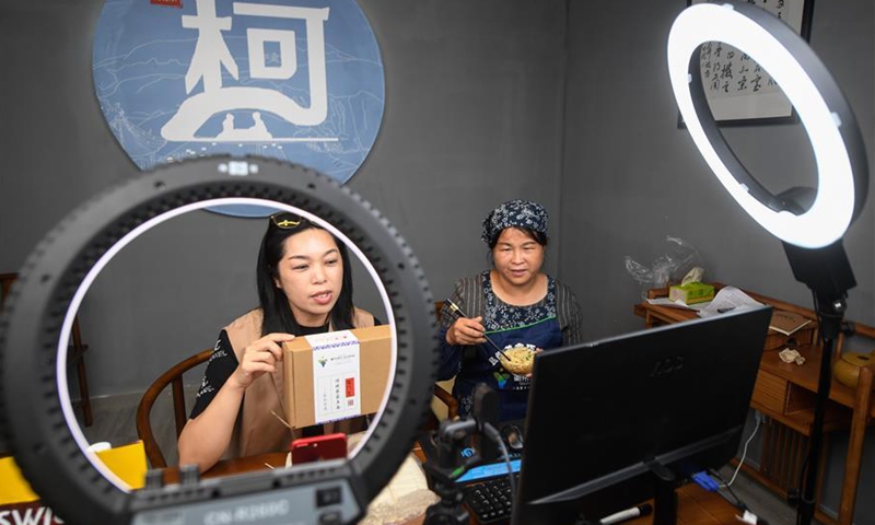 Villager Wang Huilan (R) presents handmade noodles to be sold during a live video stream in Wantian Township in Quzhou City, east China's Zhejiang Province, July 18, 2020. More than 1,000 local villagers have learned livestreaming at the Village Livestreaming College set up in Wantian Township by China's e-commerce giant Alibaba since its founding in April this year. (Xinhua/Huang Zongzhi)