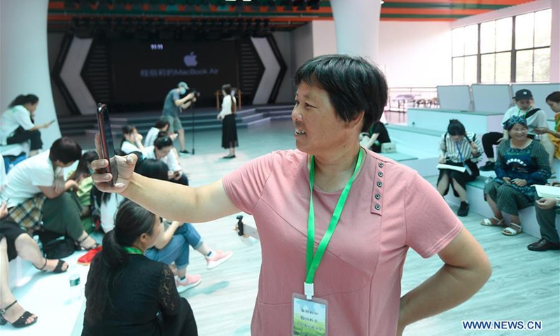 Villager Jiang Xuemei practices livestreaming at the Village Livestreaming College in Wantian Township in Quzhou City, east China's Zhejiang Province, July 18, 2020. More than 1,000 local villagers have learned livestreaming at the Village Livestreaming College set up in Wantian Township by China's e-commerce giant Alibaba since its founding in April this year. (Xinhua/Huang Zongzhi)