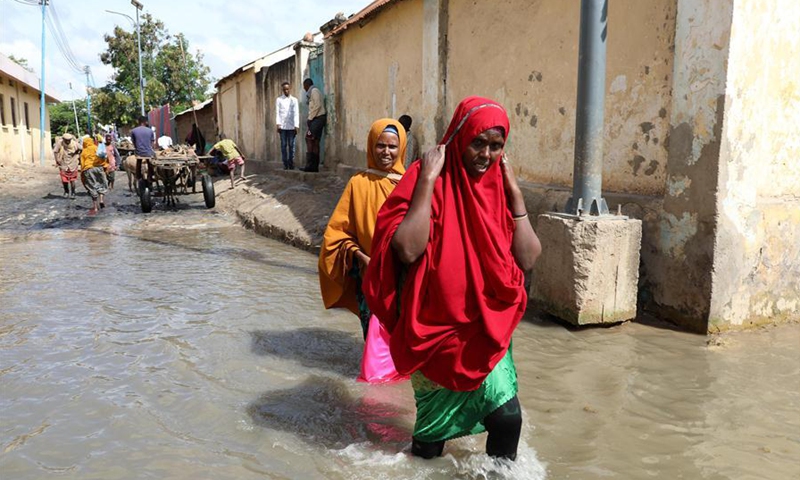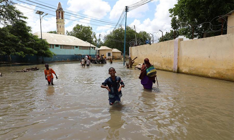 People wade through a flooded road in Afgoye, Somalia, Aug. 9, 2020. More than 150,000 Somalians have fled their homes since June due to flash and riverine flooding in the southern regions of this Horn of Africa nation, Farhan Haq, deputy spokesman for UN Secretary-General Antonio Guterres, told journalists at a virtual press briefing on Friday. (Photo by Hassan Bashi/Xinhua)
