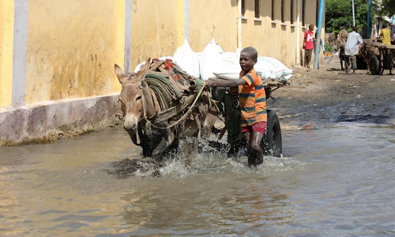 A child wades through a flooded road in Afgoye, Somalia, Aug. 9, 2020. More than 150,000 Somalians have fled their homes since June due to flash and riverine flooding in the southern regions of this Horn of Africa nation, Farhan Haq, deputy spokesman for UN Secretary-General Antonio Guterres, told journalists at a virtual press briefing on Friday. (Photo by Hassan Bashi/Xinhua)