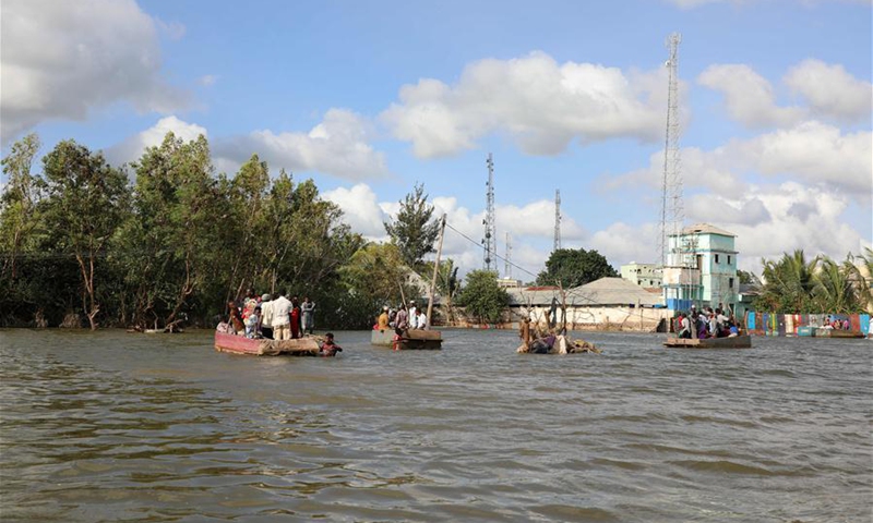 People row through a flooded road in Afgoye, Somalia, Aug. 9, 2020. More than 150,000 Somalians have fled their homes since June due to flash and riverine flooding in the southern regions of this Horn of Africa nation, Farhan Haq, deputy spokesman for UN Secretary-General Antonio Guterres, told journalists at a virtual press briefing on Friday. (Photo by Hassan Bashi/Xinhua)