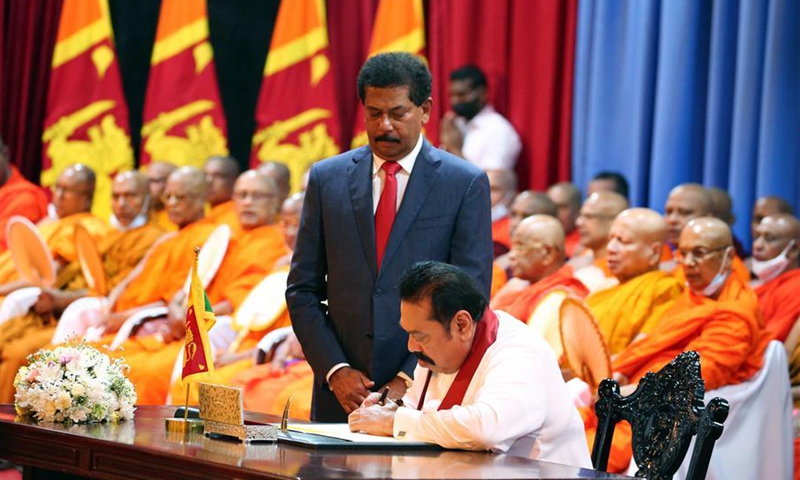 Mahinda Rajapaksa signs paper to officially assume duties as Prime Minister of Sri Lanka at Temple Trees in Colombo, Sri Lanka, Aug. 11, 2020. Leader of Sri Lanka Podujana Peramuna party Mahinda Rajapaksa took his oath as the nation's new prime minister on Sunday after his party secured a landslide victory in the recently concluded parliamentary election. (Photo by Ajith Perera/Xinhua)