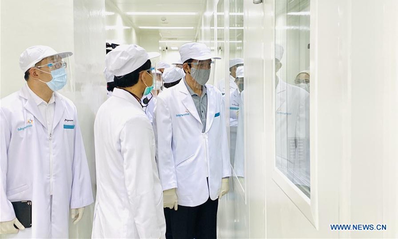 Indonesian President Joko Widodo (R) inspects the COVID-19 vaccine trials and production facilities when he visits a state-owned pharmaceutical company at Bandung, in West Java, Indonesia, on Aug. 11, 2020. Indonesian President Joko Widodo has expressed his hope that the third phase of the clinical test on anti-coronavirus vaccine would be completed within six months. The vaccine candidate is currently developed by China-based biopharmaceutical company Sinovac Biotech in partnership with Indonesia's state-owned pharmaceutical holding company PT Bio Farma. (Indonesian Presidential Palace/Handout via Xinhua)