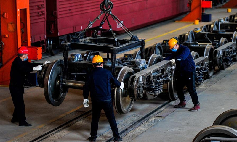 Workers conduct wheel replacement work of a train at the Erenhot Port in north China's Inner Mongolia Autonomous Region, April 12, 2020. Photo: Xinhua