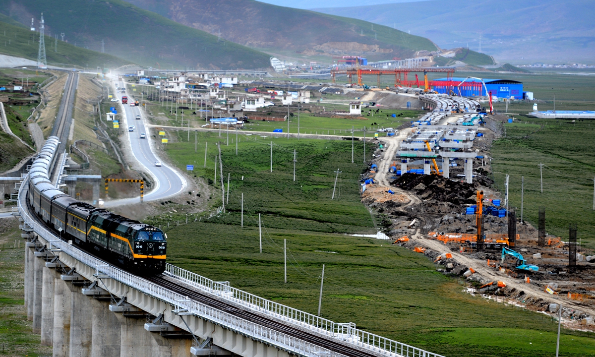 A passenger train passes a section of road renovation from Nagqu to Lhasa in Tibet in August 2019. Photo: cnsphoto